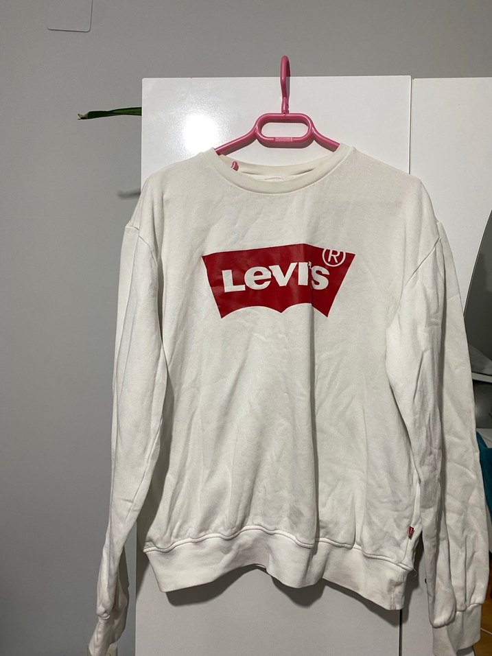 Beyaz pamuklu, uzun kollu, yuvarlak yaka, bol kesim Levis baskılı sweatshirt. Velcro detayına sahip, günlük kullanım için uygun.