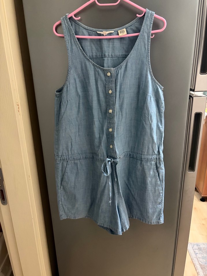 Kolsuz mavi denim tulum, yuvarlak yakalı ve düğmeli ön tasarıma sahiptir. Bol kesim ve belinde bağcıklı, rahat ve şık. Günlük kullanım için uygundur.