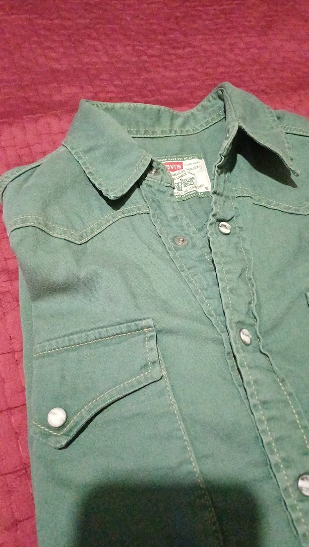 Düğmeli, uzun kollu, notlu yaka ve bol kesime sahip yeşil denim erkek gömlek. İki cep bulunur, günlük rahat giyim ,s beden