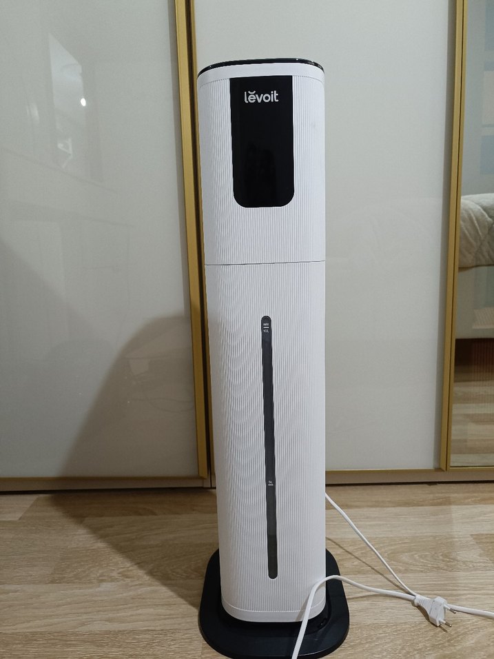 Levoit beyaz hava temizleyici ve nemlendirici, şık kule tasarımlı ve dijital ekranlı. Hava kalitesini artırır ve ideal nem seviyesini korur. ️