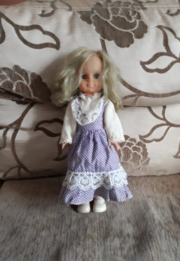 Lrydi Diana Bebek 30 cm boyunda yabancı menşeili uzun sarı saçlı bebek, beyaz bluz ve ayakkabılarla tamamlanmış pastel mor, dantelli elbise giyiyor.
