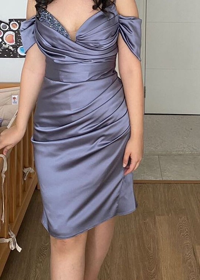 Leylak rengi, kısa, saten, drapeli abiye elbise. Bir göğsünde boncuk detayları var. Orjinali son fotoğrafta koyduğuma benzer olup boyu kısaltılmış ve önündeki parça kaldırılmıştır. Astarı mevcuttur. 2 kez giyildi. #leylak #saten #drape #abiye #elbise
