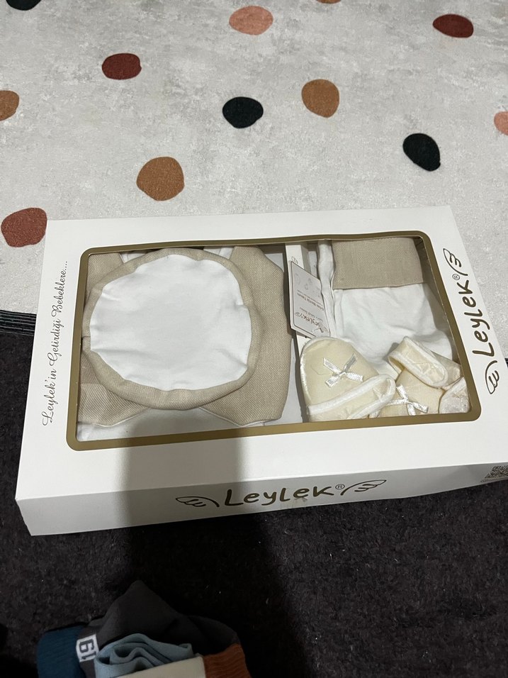 Leylek marka, beyaz renkli bisiklet yaka bebek seti. Sentetik yumuşak kumaştan, rahat kesim. 0/3 ay Mevlüt sünnet takımı