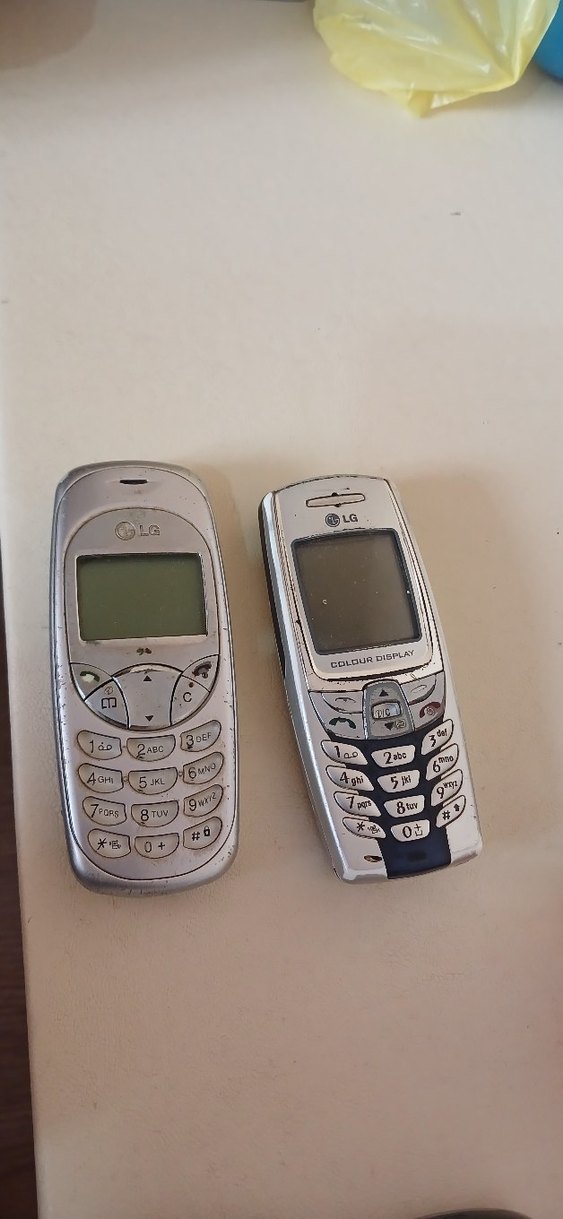 Küçük ekranlı ve fiziksel tuş takımlı gri ve beyaz renklerde iki eski LG telefon. tuşlu telefonlar gri ve beyaz LG,ve 2 tane Nokia çalışmıyor isteyen parça niyetine satarım .özelden yazın