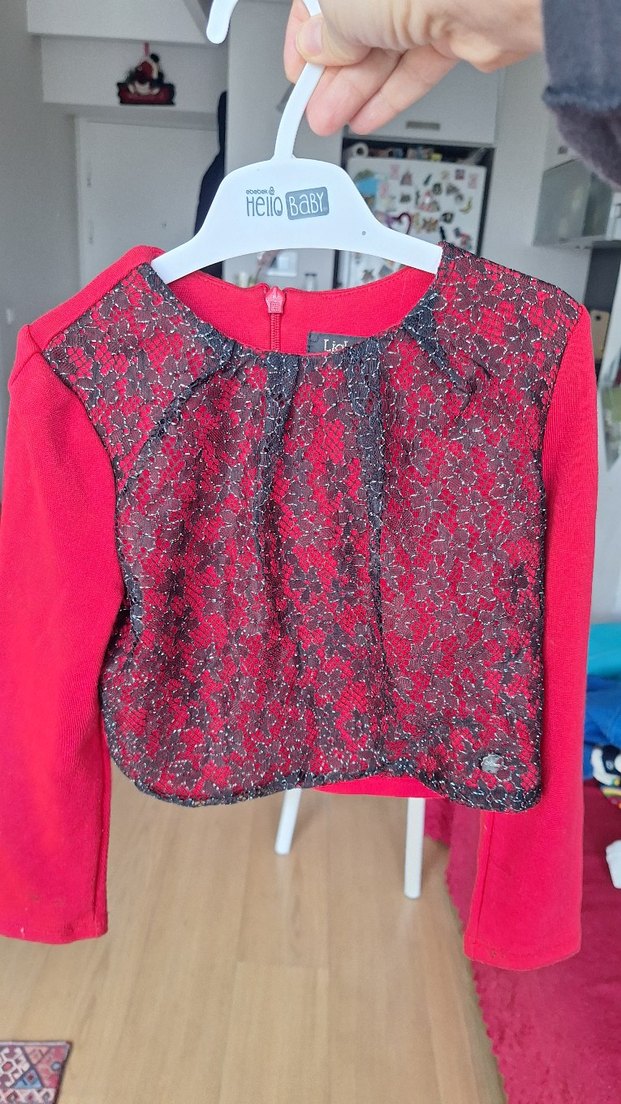 Ürün göründüğü gibidir, sadece kol kısmında geçebilecek lekesi var Kız çocuklar için uzun kollu, yuvarlak yakalı, sentetik kumaş ve baskılı dantel detaylı kırmızı, dar kesim bolero.