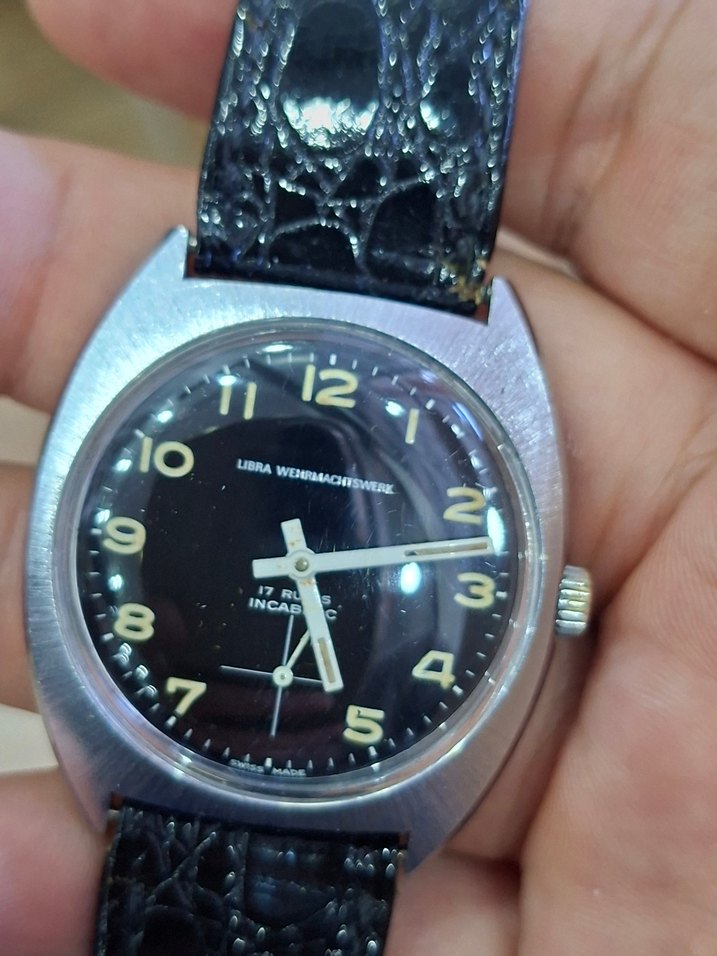 Bu vintage erkek kol saati, siyah kadran, fosforlu rakamlar ve eller, paslanmaz çelik kasa ve dokulu siyah deri kayış içerir. 17 taş ve Incabloc şok korumasına sahiptir. Ut mekanizma sıfır denebilecek durumda Orjinal tamir görmemiş koleksiyonluk 1970ler Libra wehrmathwerk Askeri tarz alttan saniye