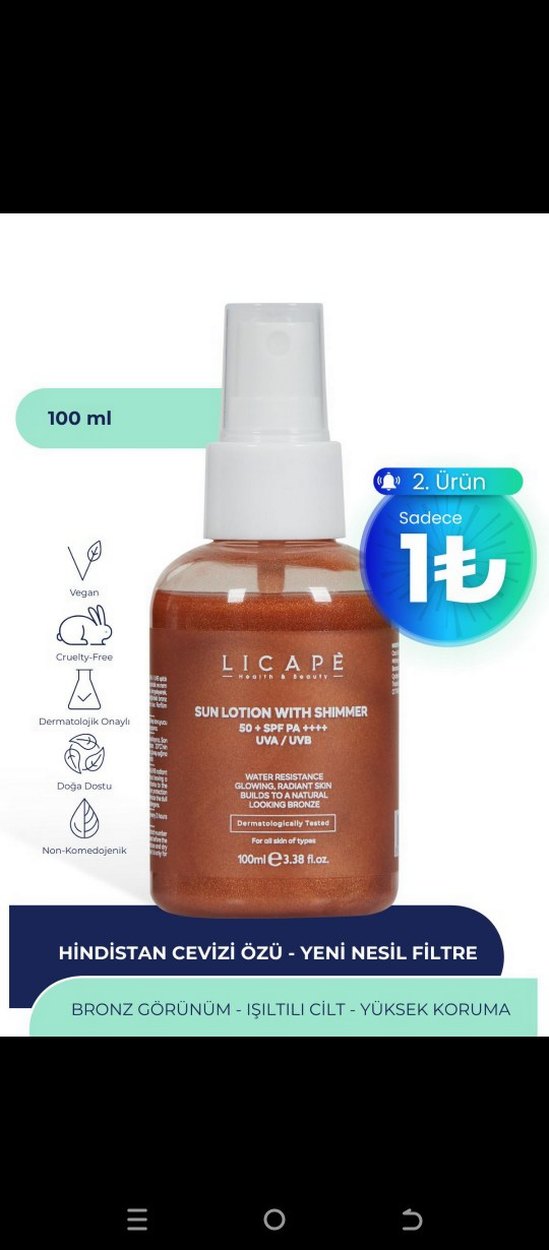 Licape güneş losyonu 50+ SPF ve PA+++ koruma sunar. Hindistan cevizi özü ve yeni nesil filtre içerir. Suya dayanıklı, parlak, doğal bronz görünüm sağlar. Vegan ve dermatolojik onaylı.