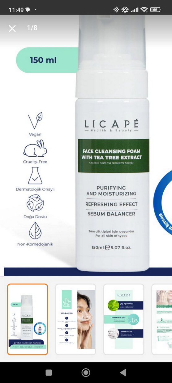 Licape çay ağacı özlü yüz temizleme köpüğü, arındırıcı ve nemlendirici özelliklere sahiptir, sebum dengesini sağlar ve ferahlatır. Benim cilt tipim kuru, daha çok karma ve yağlı ciltlere uygun o yüzden denemek dışında kullanamadım