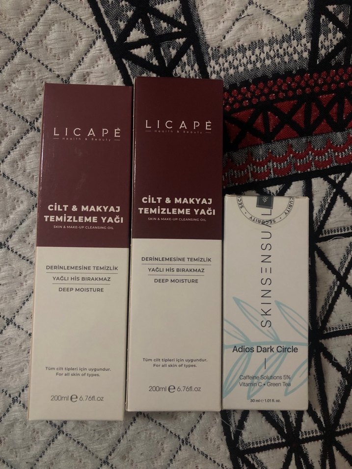 LICAPÉ cilt ve makyaj temizleme yağları derin nem sağlar, yağlı his bırakmaz. Adios Dark Circle serumu koyu halkaları azaltmaya yardımcı olur. Ürünler açılmadı,son kullanma tarihleri fotoğrafta mevcuttur.