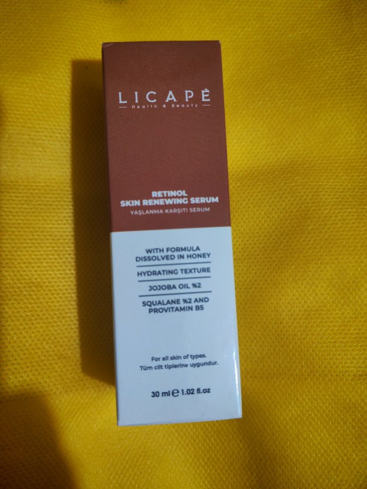 Licape Retinol Yaşlanma Karşıtı Serum, bal içinde çözünmüş formül, jojoba yağı, skualan ve provitamin B5 içerir. Tüm cilt tiplerine uygundur.