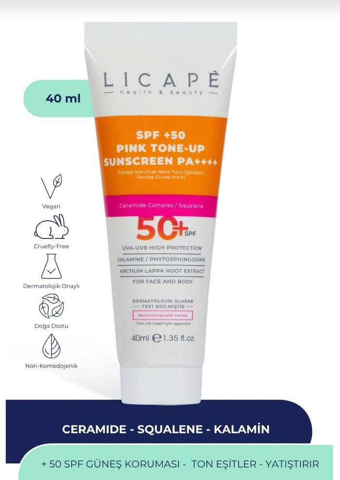 Licape güneş kremi, SPF 50+ koruma sağlar. Ton eşitleyici ve yatıştırıcı etkisi vardır. Yüz ve vücut için uygundur. Skt 07/26