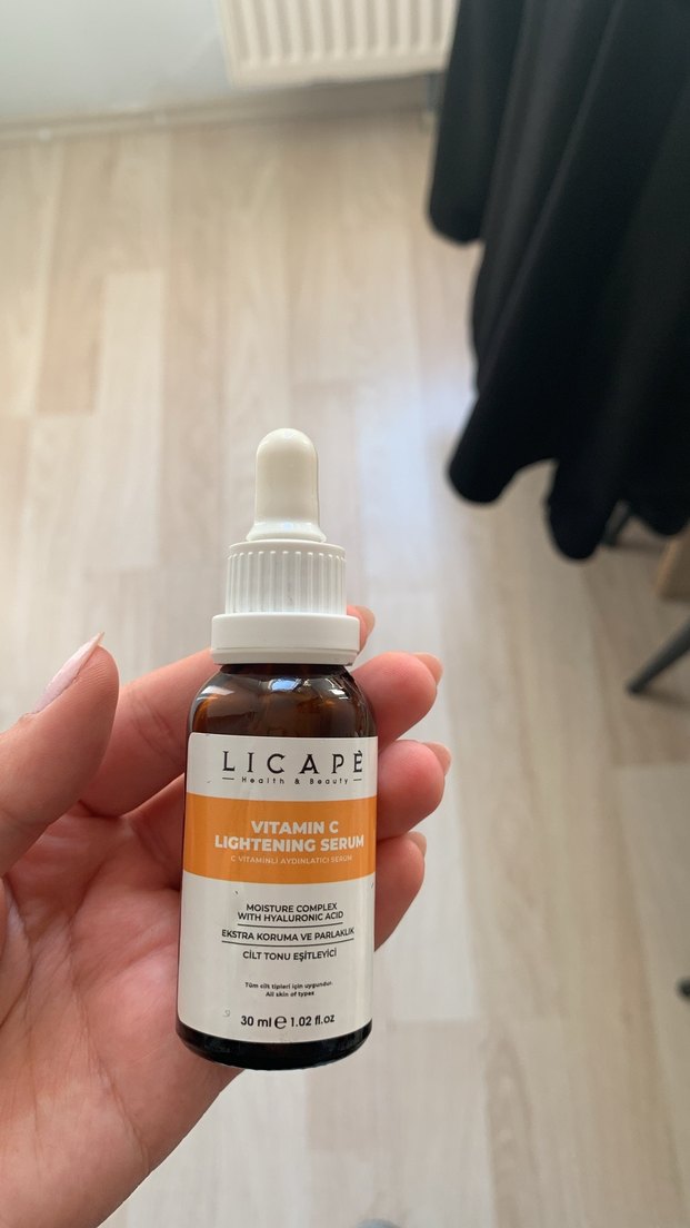 Licape Vitamin C Aydınlatıcı Serum, nem kompleksi ve hyaluronik asit ile ekstra koruma ve parlaklık sağlar, cilt tonunu eşitler. 30 ml şişe. ✨ yarıda