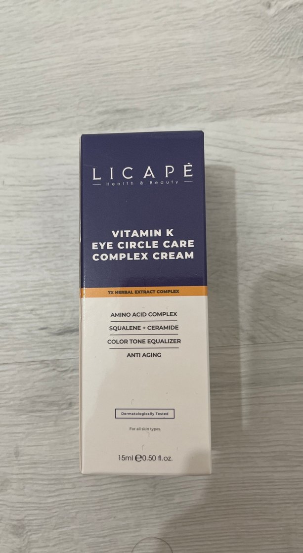 LICAPE Vitamin K Göz Çevresi Kompleks Krem, amino asit kompleksi, skualen ve seramid içerir. Renk tonu eşitleyici ve yaşlanma karşıtı bakım sağlar. Dermatolojik olarak test edilmiştir. ️