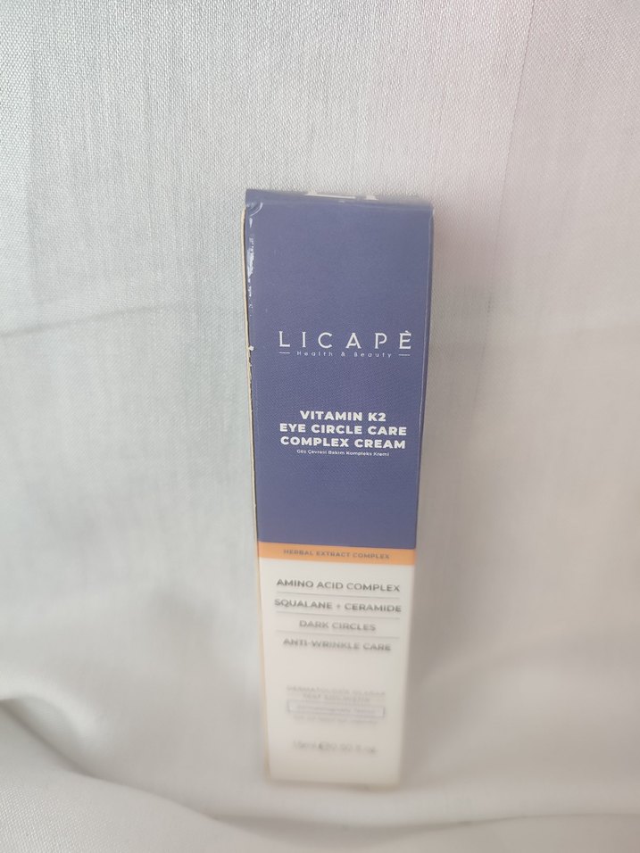 Licape Vitamin K2 Göz Çevresi Kremi, amino asit kompleksi, skualan ve seramidler içerir, koyu halkaları azaltır ve kırışıklık karşıtı bakım sağlar. SKT:09/26