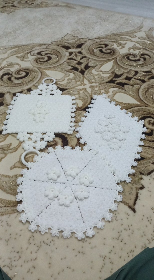 Çiçek desenli beyaz örgüden yapılmış, halkalı asma aparatlı geleneksel dekoratif set. El işi ve şık.