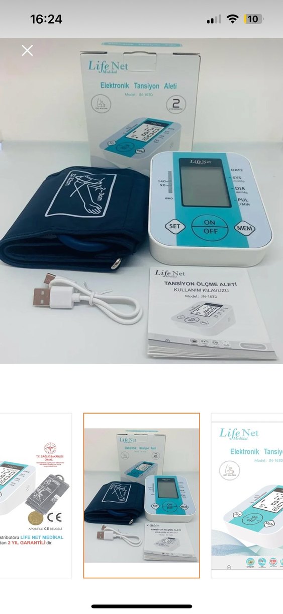 LifeNet elektronik tansiyon ölçme aleti, hafif turkuaz renkte, dijital ekran, hafıza fonksiyonu ve USB şarj özelliği ile birlikte gelir. Manşon ve kullanım kılavuzu dahildir. ⏱️