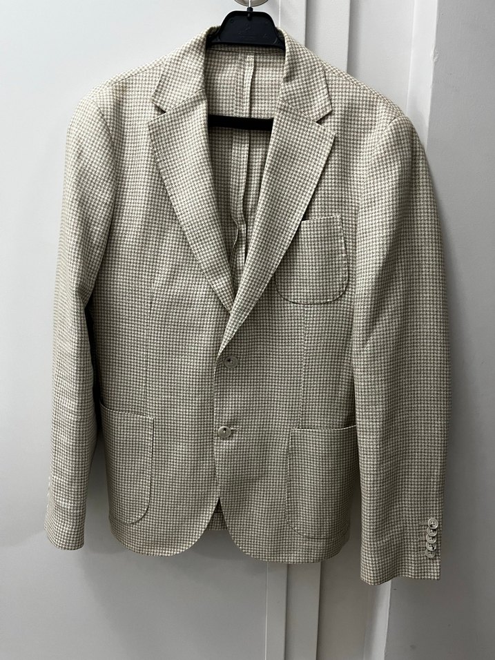 Bej keten kumaştan, klasik kesim, düğmeli erkek ceket. Uzun kollu, normal boyda ve gri desenli, ofis için uygun şık bir model.