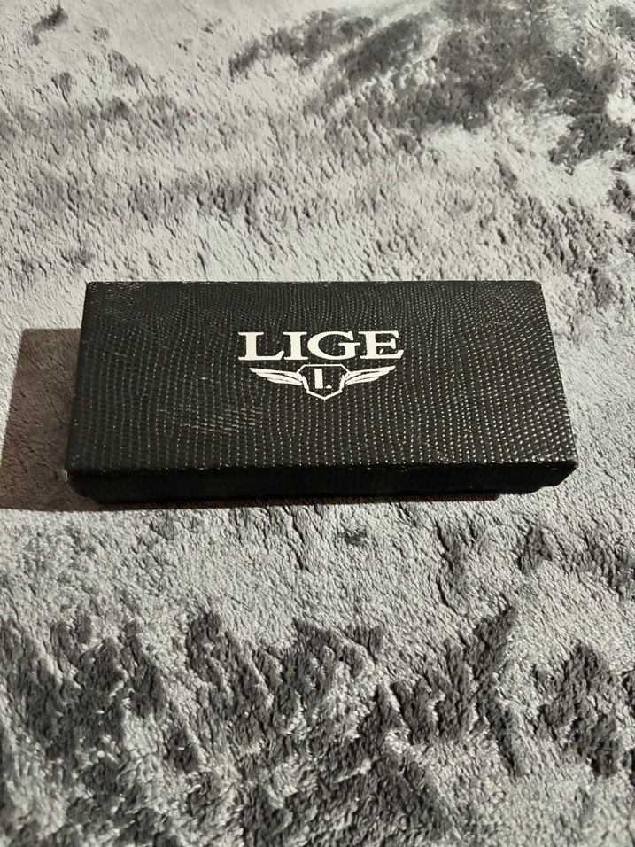 LIGE markalı siyah erkek cüzdan, minimalist baskılı tasarıma sahip, biker ve rock punk tarzını yansıtıyor. Kompakt ve kullanışlı.