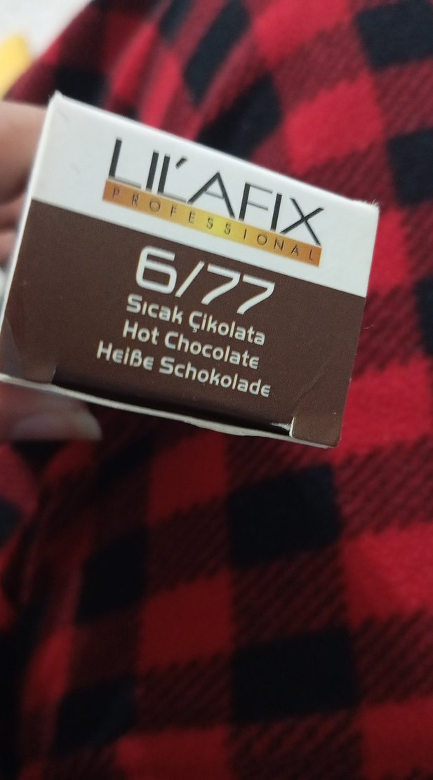 LIILAFIX Professional 6/77 Sıcak Çikolata saç boyası, saçlar için zengin ve sıcak tonlar sunar. Ürün adı dört dilde yer almaktadır.