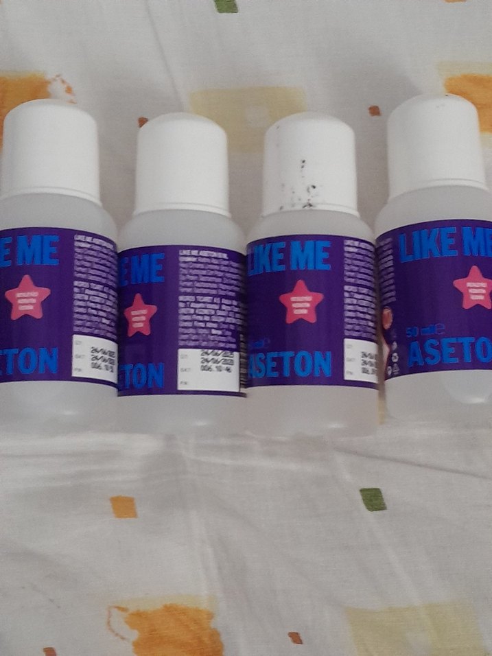 Like Me markalı, beyaz kapaklı ve mor etiketli 4 şişe asetondan oluşan set. Oje temizlemek için kullanılır.
