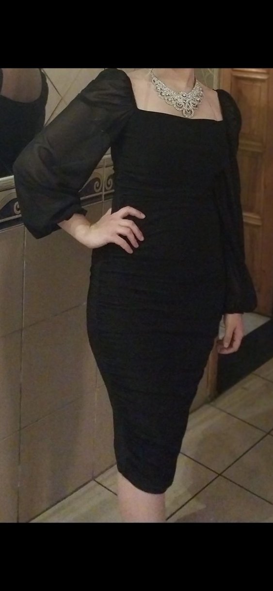 likralı büzgülü siyah Elbise,kolları şifon,arkası yırtmaçlı,yanlardan büzgülü