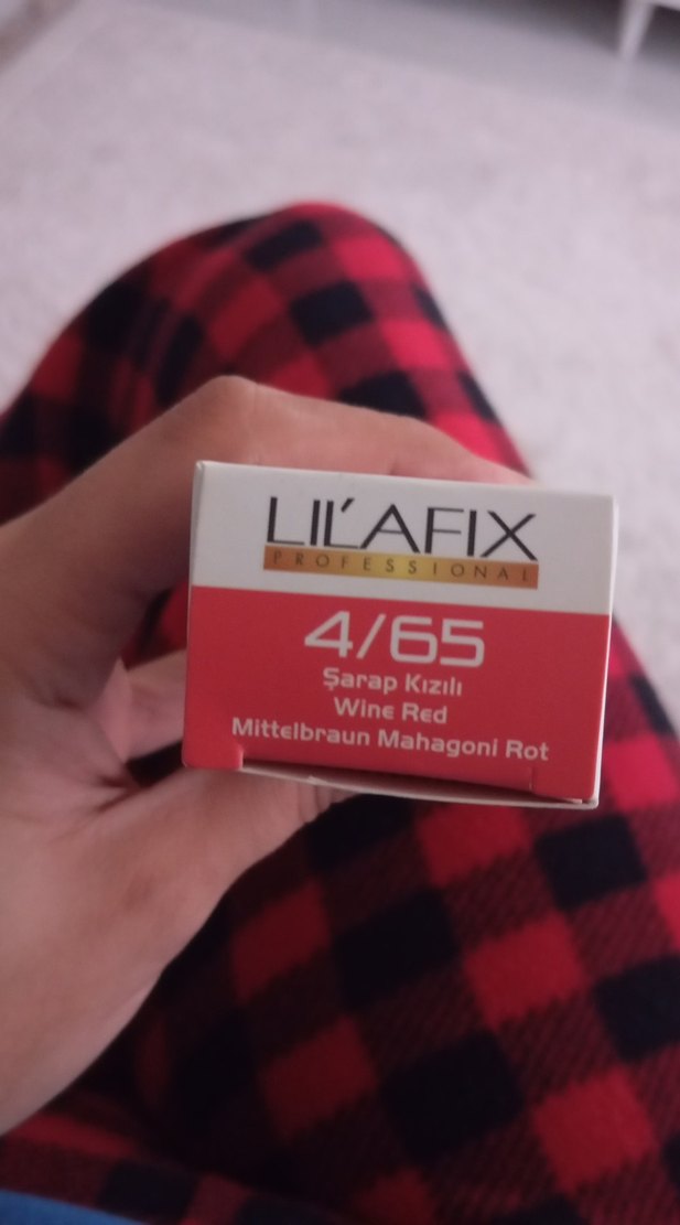 LIL'AFIX saç boyası 4/65 numara, orta kahverengi mahagon kırmızısı ve şarap kırmızısı tonlarında zengin renklendirici.