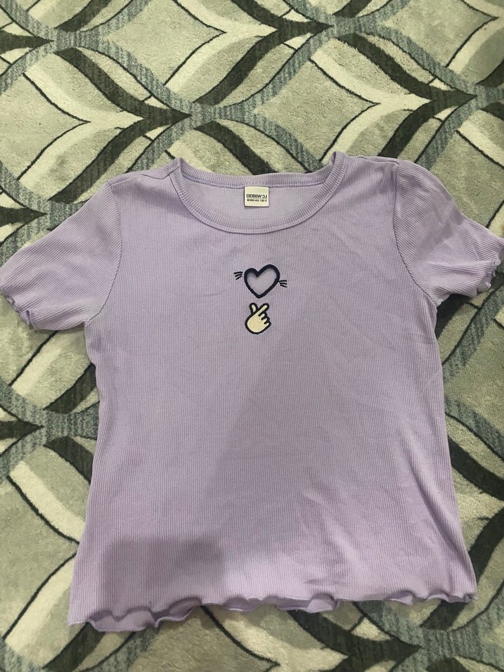 Lila renkli, kısa kollu kız tişörtü, yuvarlak yaka ve baskılı kalp ile el işareti deseni içerir. Pamuk kumaştan, bol kesimle rahat ve şık bir görünüm sunar.