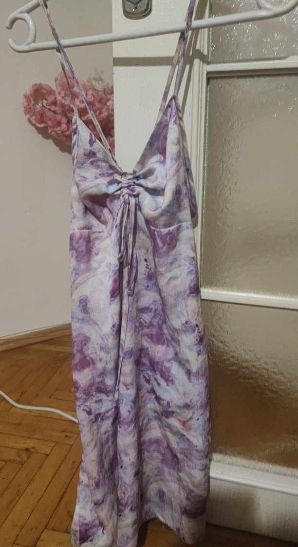 Lila batik desenli, askılı mini elbise. Salaş kesim ve drapeli tasarımıyla bohem tarzı yansıtıyor.