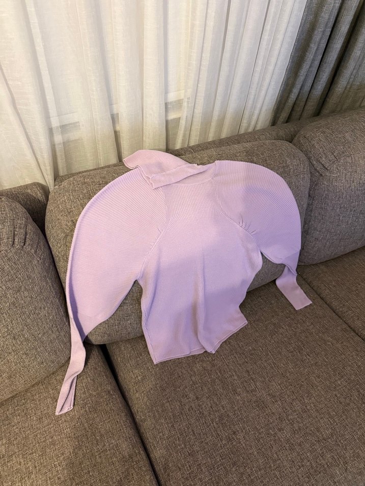 Lila renkte, boğazlı ve uzun karpuz kollu, ince ve yumuşak dokulu triko kazak. Normal midi boyda, sade ve desen içermeyen tasarıma sahip. Günlük kullanıma uygun.