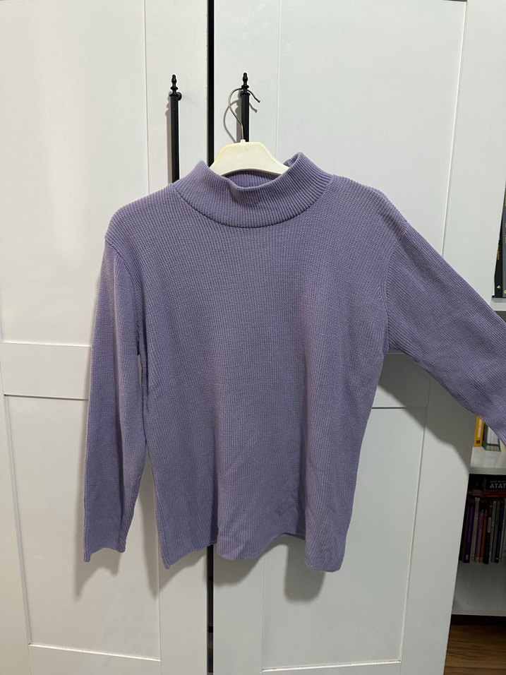 Lila renkli, boğazlı ve uzun kollu triko kadın kazak, rahat kesimiyle günlük kullanıma uygun, pastel tonlarda normcore tarzında bir parça. S m standart beden marka temsili etiketsiz yeni