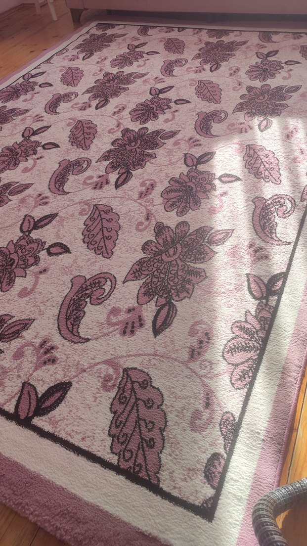 Pastel pembe lila renkte, çiçek ve yaprak desenleriyle bohem tarzda yumuşak dokulu halı.