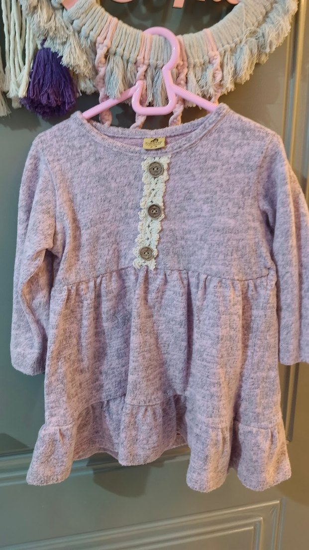 lila renkte, uzun kollu, yuvarlak yakalı ve düğmeli dantel detaylı örme kumaştan bohem tarzda kız elbisesi.