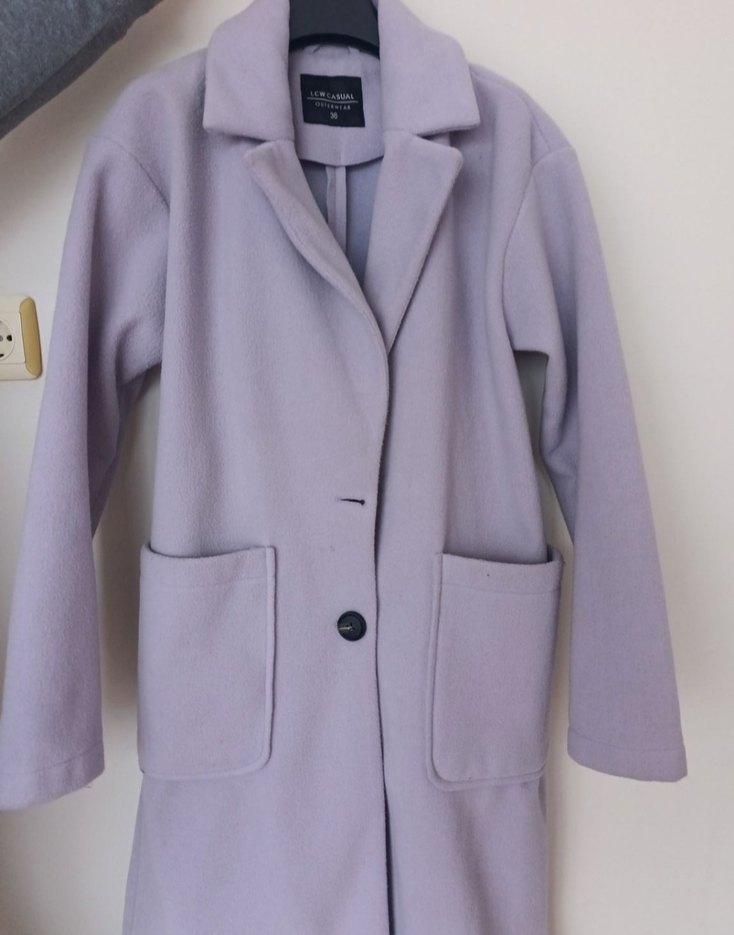Lila renkte, yumuşak dokulu, büyük cepleri ve düğmeli kapaması olan uzun kaban.Küçük lekesi var ama yıkayınca çıkar taşınma sürecinde olduğumdan zamanım yok maalesef
