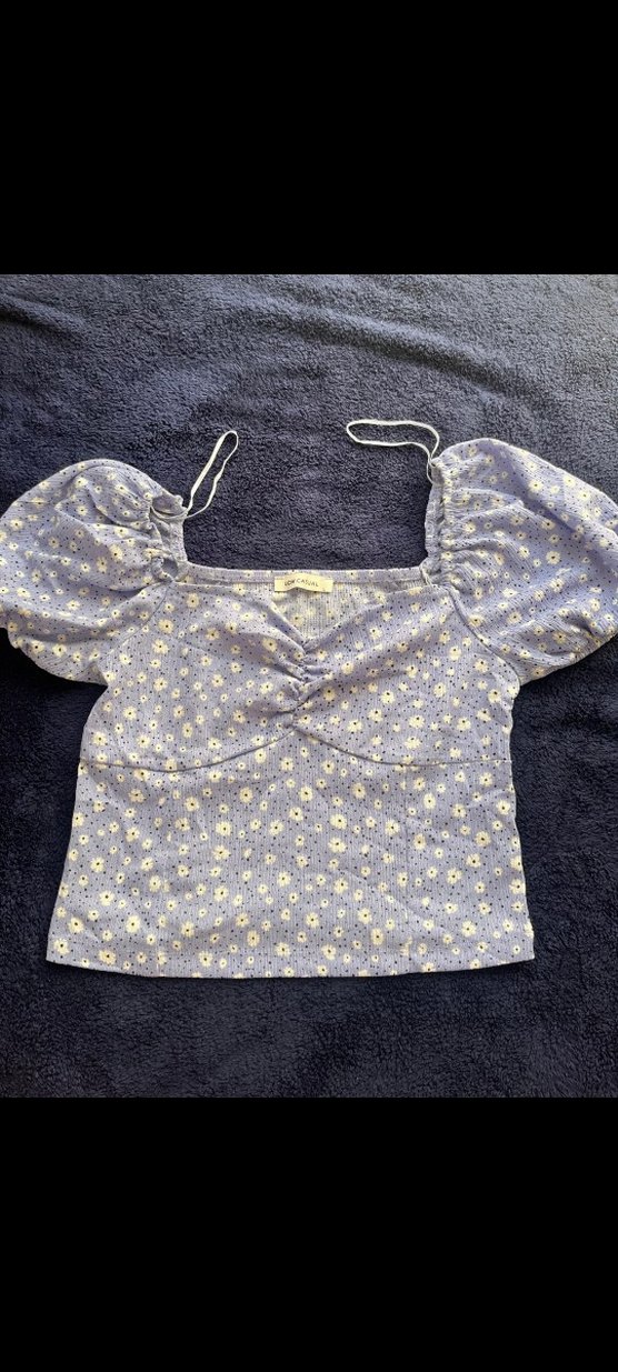 Kısa boylu, kısa balon kollu, V yakalı, düğmeli, küçük çiçek desenli yumuşak sentetik kumaştan yapılmış fitted bluz.