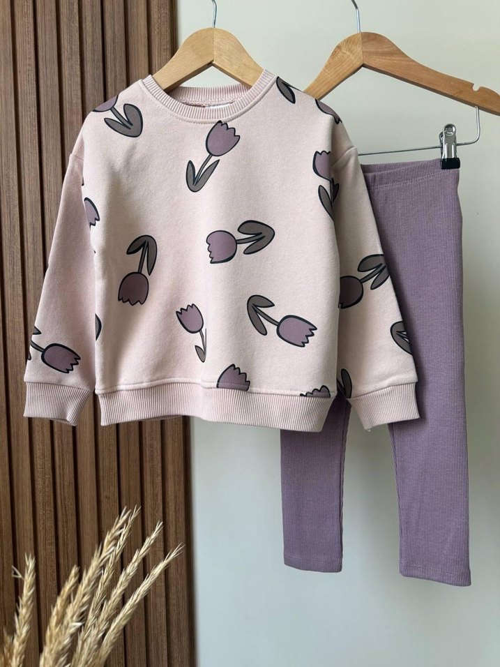 Uzun kollu, mor çiçek desenli üst ve lila örme tayttan oluşan pastel renkli bebek kız takımı.