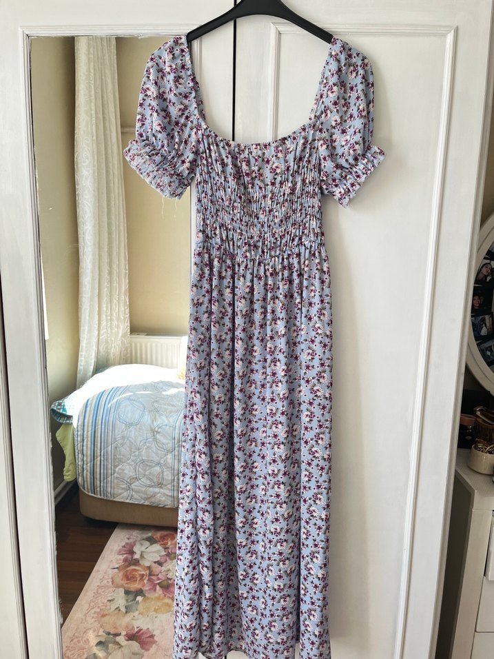 Lila çiçekli likralı Bohem Tarz Uzun Rahat Elbise