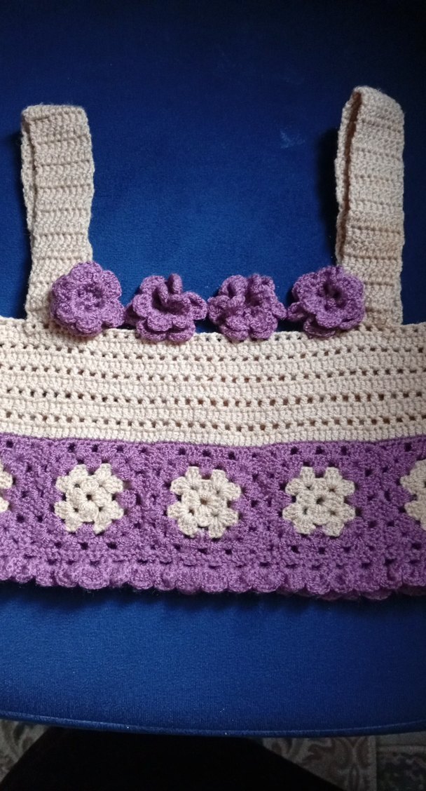 Lila renkli, dantel çiçek detaylı, askılı ve kayık yaka kız çocuk örgü büstiyer. Bohem tarzında, rahat kesim.eni 28 cm uzunluk 26 cm