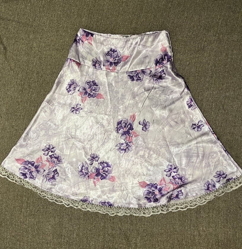 Lila tonlarında pastel bağlama desenli, dantel detaylı, bol kesim etek. Saten kumaş 42 yazıyor ama M-L bedene daha uygun