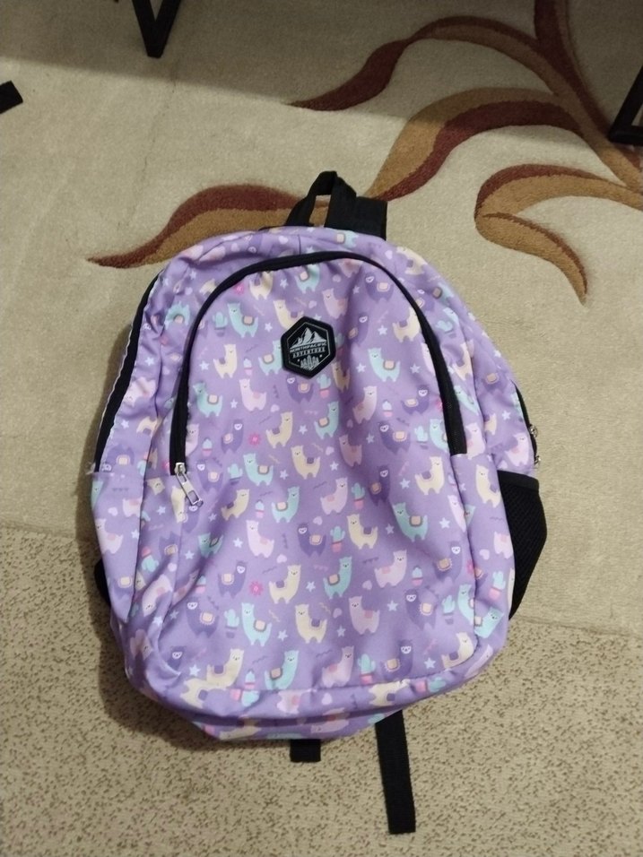 Pastel lila renkte, sevimli lama desenli çocuk okul çantası. Ayarlanabilir askıları ve yan cepleri ile pratik kullanım sağlar.
