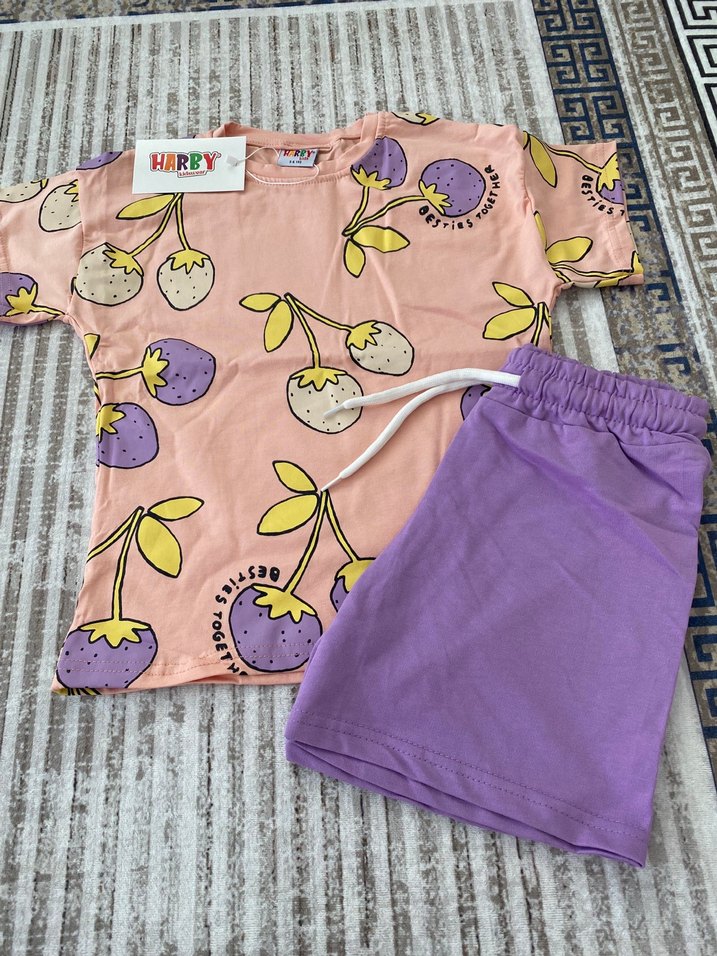 Lila ve pastel tonlarda, kısa kollu, dantelli baskılı üst ile ayarlanabilir bel bantlı düz şorttan oluşan kız bebek takımı. Marka: HARBY.