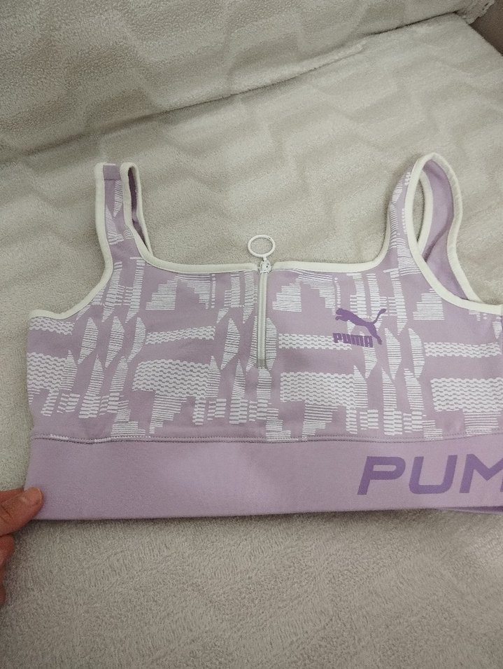 Pastel lila renkte, desenli ve ön fermuarlı Puma spor sütyeni. Streetwear tarzında, normal midi boyda. ️♀️