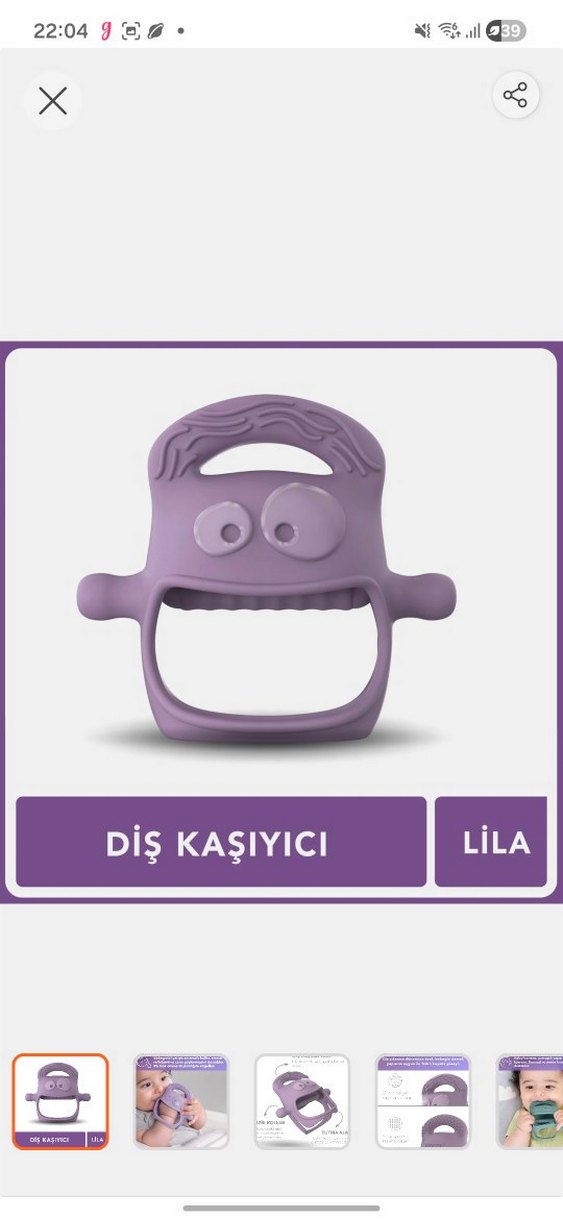 Lila renkte, yumuşak dokulu diş kaşıyıcı ve çıngırak. Bebeklerin diş çıkarma döneminde rahatlamasına yardımcı olur.