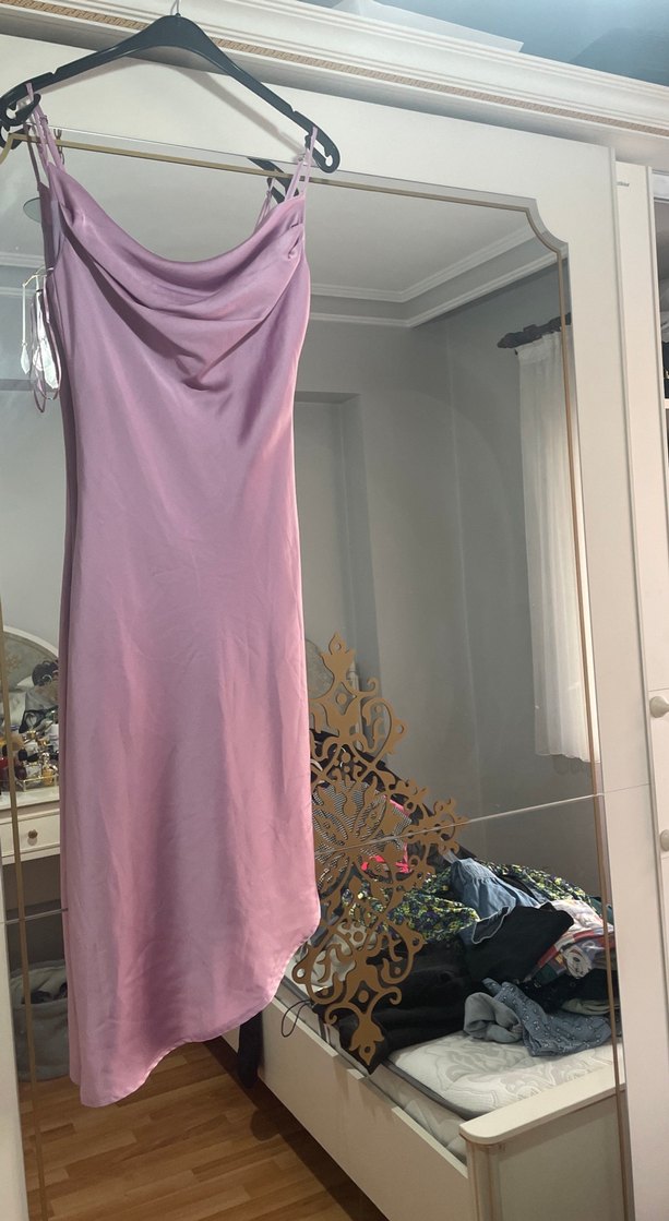 Mor renkte, askılı ve drapeli uzun elbise. İnce oturan kesimi ve satenimsi kumaşıyla şık ve çağdaş bir görünüm sunar.