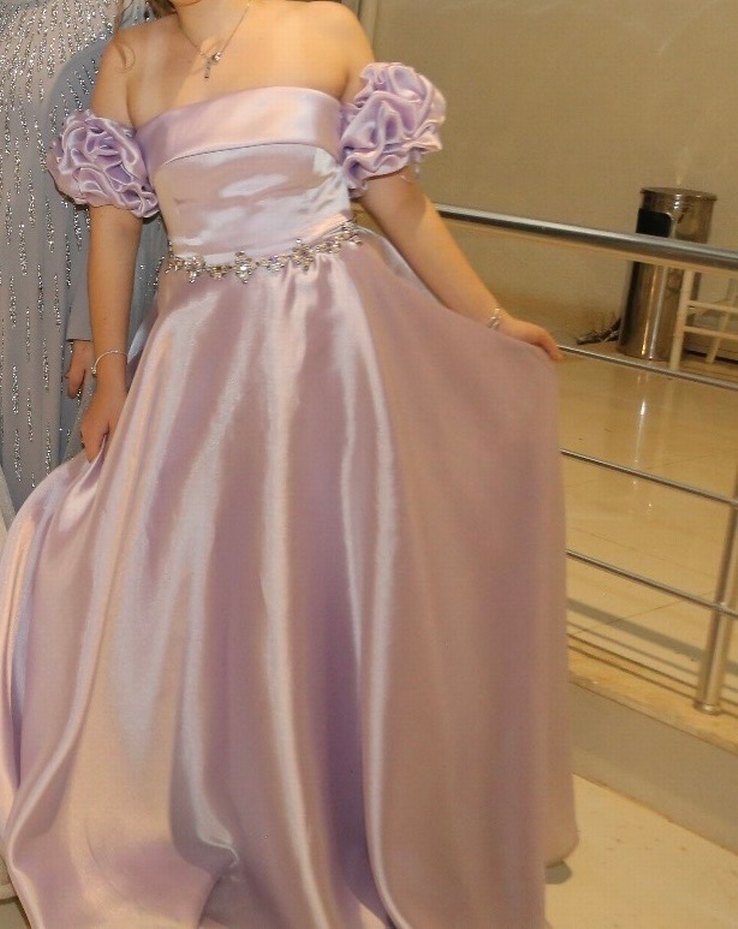Pastel mor renkte, straplez yakalı ve drapeli kabarık kollu uzun abiye elbise. Belde zarif süslemeler ve geniş kesim ile şık bir görünüm sunar. Bir kere düğünde giyildi arkası fermuarlı