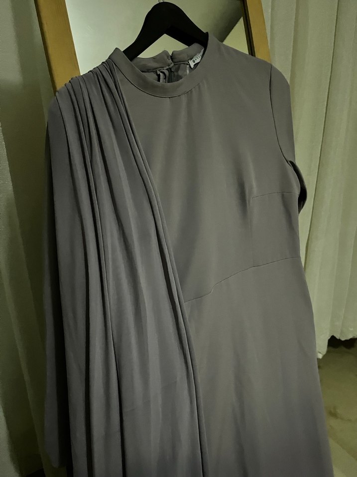 Yüksek yakalı, kolsuz, gri renkte, drapeli detaylı uzun kadın elbisesi. Düzenli kesim ve yumuşak sentetik kumaştan, günlük kullanıma uygundur.