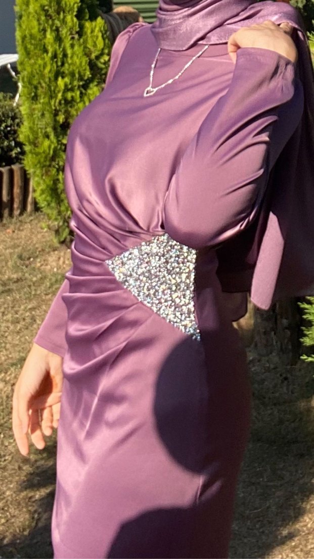 Parlak lila saten kumaştan, straplez yaka ve drapeli tasarıma sahip, bele ışıltılı detay eklenmiş, uzun ve vücuda oturan abiye elbise. Sadece 1 kez giyildi.