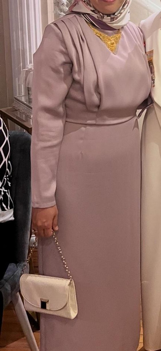 Bu kadın abiye elbise, uzun kollu ve yakasında drapeli detaylara sahip. Lila renkte, düzenli kesim ve modern klasik tarzda, düğünler için uygun. 1 defa giyildi