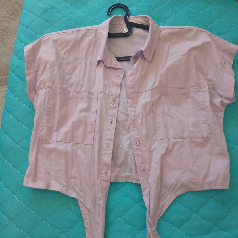 lila renkli keten kumaştan, düğmeli ve yakalı, kısa kollu bol kesim gömlek. Günlük rahat sokak stili için uygundur.