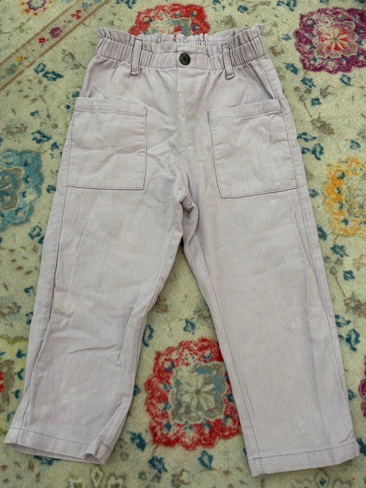 Bej renkli pamuklu kumaştan yapılmış, düğmeli ve cep detaylı, rahat kesim erkek çocuk pantolonu.