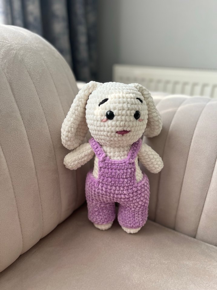 Lila tulumlu, örgüden yapılmış, yumuşak ve el yapımı tavşan peluş oyuncak. İstenilen renkte sipariş alabilirim. In.s - gamzelilmek takip edebilirsiniz.